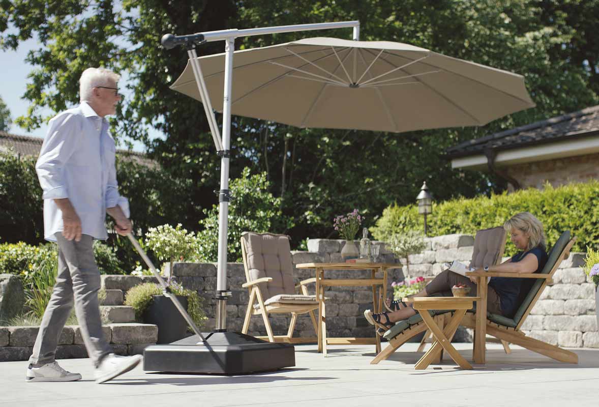 Wer kennt es nicht: Die Sonne wandert, aber der Sonnenschirm bleibt stur an seinem Platz. Mit den LiRo-Schirmständern gehört das mühsame Umstellen und Schleppen endlich der Vergangenheit an. Dank ihrer patentierten Konstruktion lassen sich die Ständer bequem in aufrechter Körperhaltung verschieben – so entsteht Schatten genau dort, wo Sie ihn brauchen.
