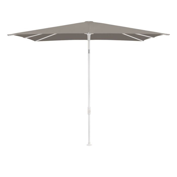 Das weiss und anthrazit pulverbeschichtete Aluminium des Gestells und der Streben sorgt mit dem flachen Schirmdach für die moderne, schwebende Optik. Der hochwertige Schirmstoff ist dank flexibler Enden selbstspannend. Für den Stock mit innenliegendem Standrohr sind diverse Sockel und Bodenhülsen erhältlich. Typisch Schweizer Präzision.