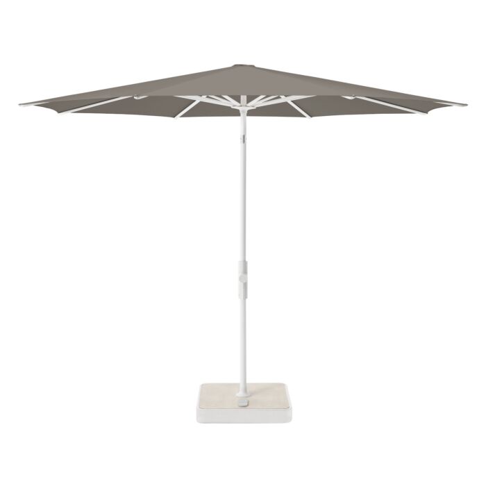 The white and anthracite powder-coated aluminum of the frame and the struts provides with the flat umbrella roof for the modern, floating look The high-quality umbrella fabric is self-tensioning thanks to flexible ends For the stick with internal stand tube is an under stick available, with which the umbrella height can be adjusted and thus always guarantees an optimal shade Typical Swiss precision.