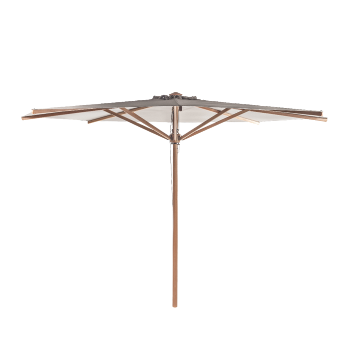 Our Cuba parasols with central pole have a wooden frame. High-quality eucalyptus wood from organic, tropical plantations. These umbrellas age gracefully when exposed to sunlight and change color to a beautiful light silver. Different wood treatments are available depending on your preference.