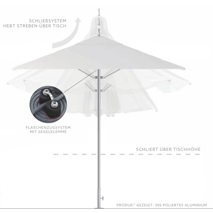 .The Ocean Master M1 Autoscope by Tuuci is the first center pole umbrella of the brand Tuuci which has the Autoscope function as standard.... Through the Integrated lifting system, you can open and close the umbrella quite comfortably by means of the cable system always above your table / lounge. With its size of 300 x 300 or 245 x 365 cm in the express program, the umbrella covers the most used sizes and allows you to create the perfect shade Thanks to its special opening system and the passage height of 132 / 123 cm, this umbrella always closes over your furniture or barbecue. Thanks to its stand tube, it is possible to rotate the pole 360 °.