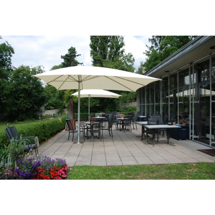 Der Facil 76 vom deutschen Schirmhersteller SCHNEIDER mit 76mm Mastdurchmesser besitzt das einzigartige Öffnungssystem Facil. Es öffnet den Schirm binnen weniger Sekunden. Für die Bespannung stehen verschiedene Stoffqualitäten zur Auswahl, die handwerklich geschnitten und genäht werden. Optionen wie Motor Seitenwände und Regenrinnen können optional ergänzt werden.